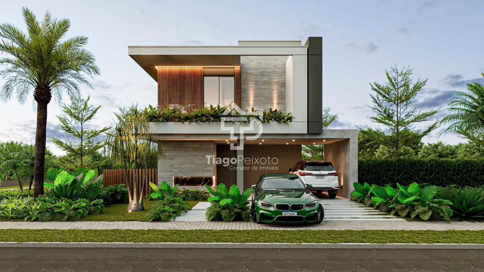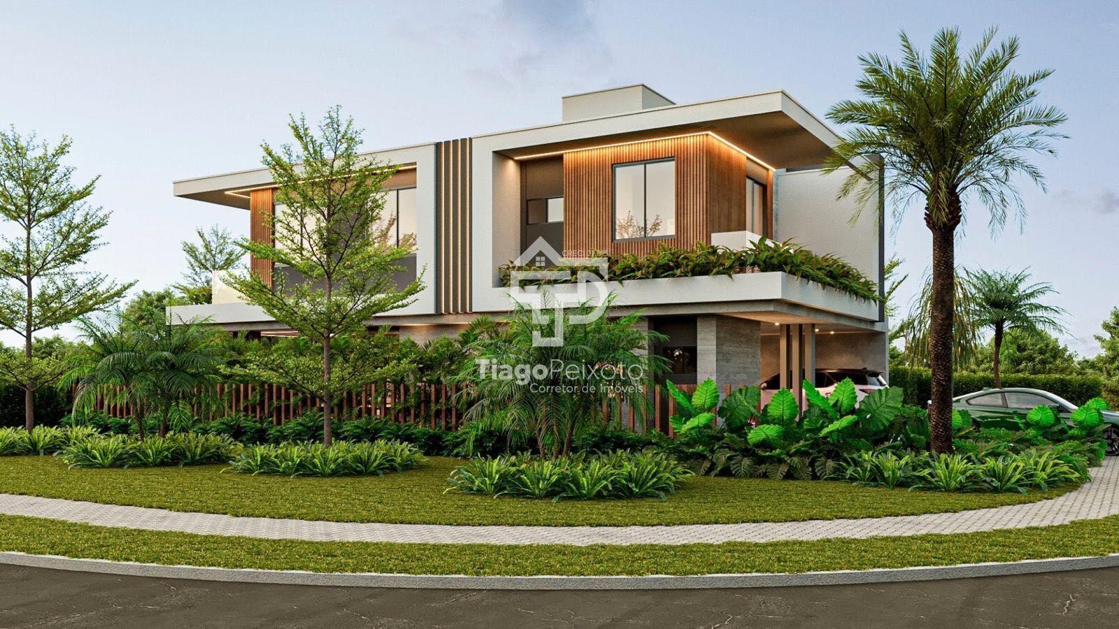 No pavimento térreo, sala de estar e jantar integradas à cozinha criam aquele ambiente amplo onde a convivência acontece. Uma suíte de hóspedes completa com banheiro próprio resolve quem chega sem invadir a privacidade da casa. Lavabo, área de serviço e garagem completam a praticidade do dia a dia.