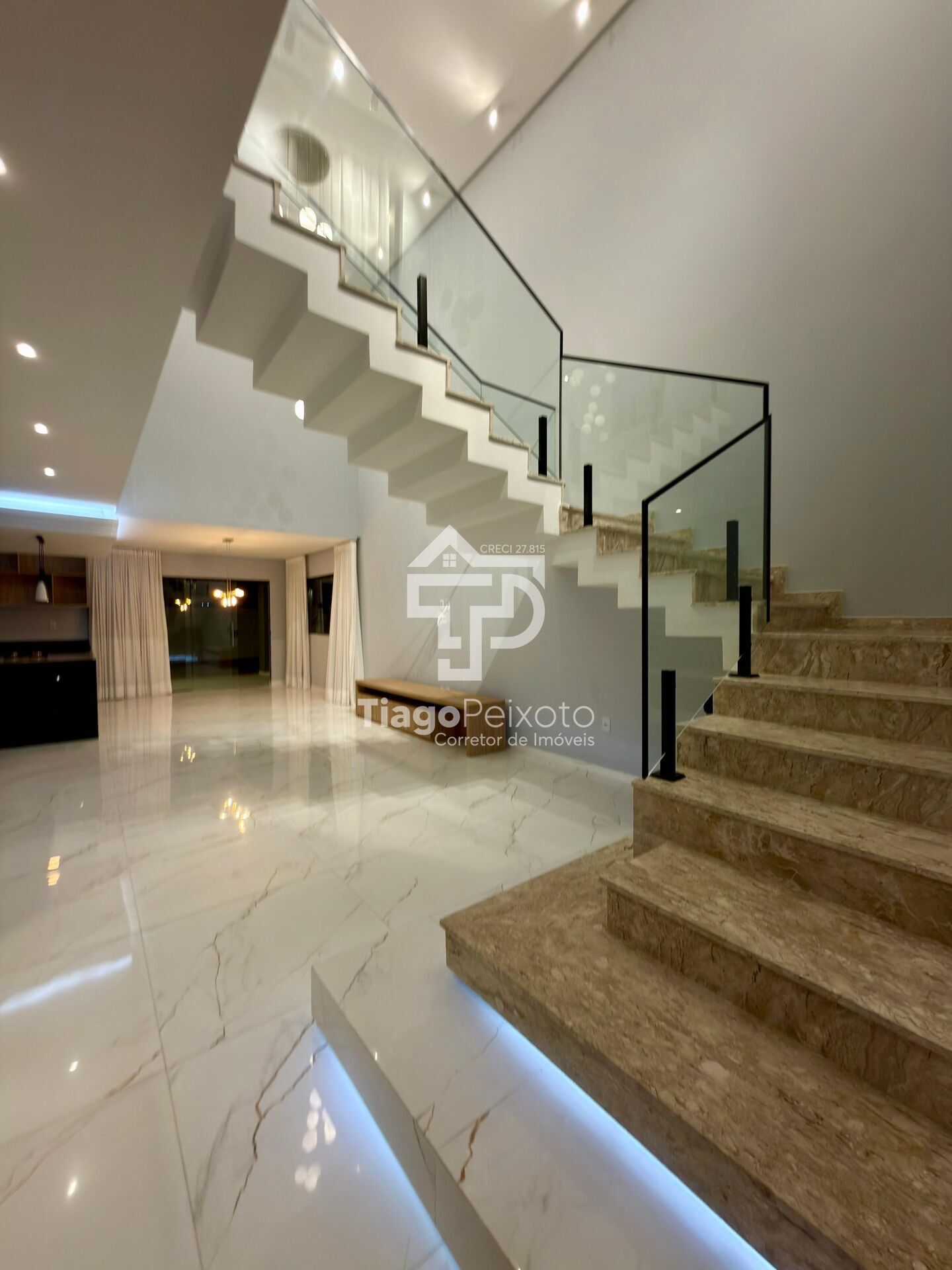 ✨ O pavimento térreo te recebe com uma generosa sala de estar com pé direito duplo, que transmite amplitude e grandiosidade. O lustre pendente em formato de esferas de vidro é o ponto focal do ambiente, criando uma atmosfera sofisticada que se integra harmoniosamente à sala de jantar.